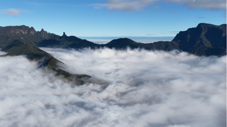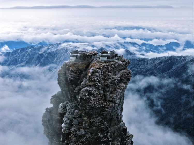 登上金顶,云海在脚下无尽铺展——仿佛整个世界,只剩下风的声音、雪的呼吸,以及天地初开般的宁静。俯瞰脚下翻涌的云海与寂静的雪岭,那种由垂直地貌所带来的视觉与心灵的双重震撼,正是贵州之冬不可替代的礼物。
